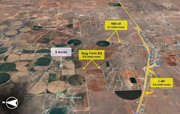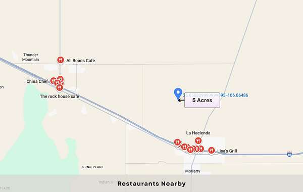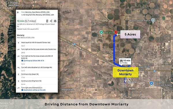 Starting from Moriarty Town Hall, head south on Broadway Street toward Center Avenue. Turn left onto U.S. Highway 66 and continue east for about half a mile. Turn right onto State Road 41 and drive south for approximately 3.5 miles. Then, turn left onto Martinez Road and continue for about 1.5 miles. Turn right onto Diamond S Lane and follow the road until you reach the property--0 Diamond S Lane.