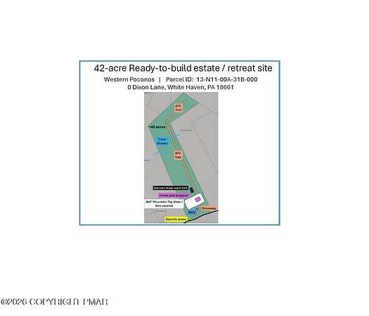 Rare opportunity to own a 42-acre ready-to-build private estate or retreat site in the Western Poconos. This is not raw land -- the groundwork has already been completed, saving significant time and development costs. The property features a cleared mountaintop homesite with stunning 360-degree views, offering the perfect setting for a luxury home, barndominium, or private compound. Enjoy the natural beauty of the land with four streams, including a trout stream, along with an established ATV and off-road trail system throughout the property. An engineered driveway is already installed, along with a well on site and electric available at the front of the property, making this truly shovel-ready. The property includes a septic permit for a 5-bedroom home, as well as approved permits and plans for a 6,000 sq ft barndominium and pole barn, including mechanical, electrical, and plumbing plans. Additional site work has been completed, including site pad preparation and clearing of the mountaintop homesite. Located just minutes from I-80 and I-476, this property offers convenient access to major metro areas, approximately 2 hours from NYC and 90 minutes from Philadelphia. With no HOA restrictions, this is an ideal opportunity for a private estate, recreational retreat, or investment property in the heart of the Poconos.