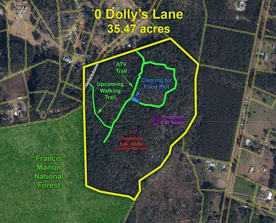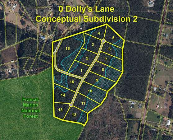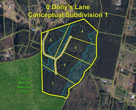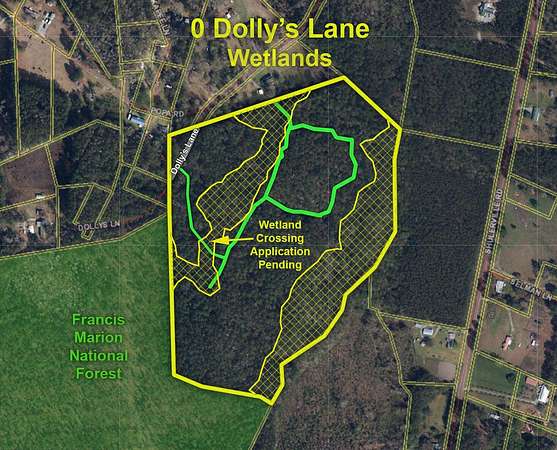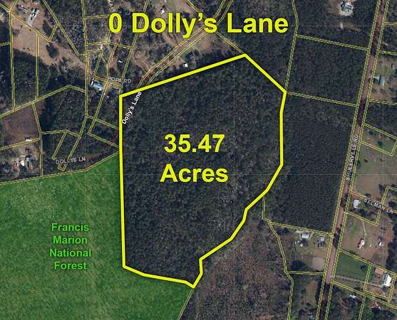 Tucked away down a quiet country lane in beautiful Shulerville, 0 Dolly's Lane is a rare Lowcountry find -- an expansive 35.47-acre tract sharing over 1,400 feet of property line with the Francis Marion National Forest. Whether you are looking for a great recreational tract, a private retreat, or a development opportunity, this land invites you to make it your own.At its heart, this property is a recreational paradise. There is a great mix of uplands with mature pines and oaks, and two bands of wetlands, including the eastern boundary, which runs along a seasonal creek that is currently dry. An established interior road and a cleared food plot, ready for planting, make for excellent hunting grounds. Of course, all of the adjacent government land greatly expands your huntingopportunties too! The property could also be sculpted into a great off-roading track for 4-wheelers and motorcycles or improved for horses where you could ride straight into the Francis Marion. You're also just 15 minutes from the Jamestown boat launch on the Santee River for prime fishing, hunting, and paddling. And for boaters, your just 20 minutes from the Wando River Marina and McClellanville Boat Landing and 35 minutes to Lake Moultrie. For those dreaming of a private estate, the groundwork has already been laid with a 4-bedroom septic permit in hand. Imagine building your dream house here, with no neighbors in sight just you, the stars overhead, and the sweet melody of the whip-poor-wills. All of this and it's less than 30 minutes to Park West in Mt. Pleasant and only 20 minutes to the great seafood restaurants in beautiful McClellanville. Investors and developers will appreciate the FLEX-1 zoning, which allows for lots as small as .69 acres. Whether you envision a small community of country homes or simply wish to hold a large piece of beautiful land, the possibilities are wide open. A wetland delineation identified approximately 11.5 acres of wetlands, and an application is pending for a wetland crossing to give even easier access to the center of the property. It's even zoned for a campground. Finally, the stand of mature timber presents an additional income opportunity, ready for harvest whenever you choose. 0 Dolly's Lane is a blank canvas in one of the most naturally rich areas of South Carolina. Whether you're called here by the thrill of the hunt, the promise of privacy, or the potential for growth, this property promises a future as bold as the landscape that surrounds it.