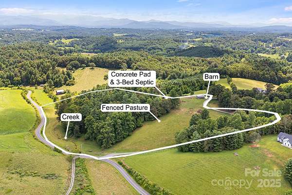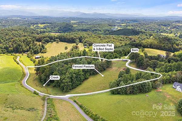Located in Buncombe County with amenities just a few minutes away, this is a dream property if seeking land with views, fenced pasture, & a great building site with well & septic already installed. As a bonus, there is already a build-ready 36x50 concrete slab with stubbed out plumbing ready for your outbuilding, workshop, garage, or whatever else you may need it for. This property will make a great private estate, mini-farm, or great mountain vacation home. Seller to subdivide approximately 12.15 acres off of larger parcel prior to closing. There is already fenced pasture, partially wooded, with a babbling creek that runs parallel to the road and approximately 856' of road frontage. There is abundant wildlife on the property as well - turkey and deer are daily visitors. This is a must see property for those seeking privacy and tranquility in the country. Shown by appointment only. Video here: