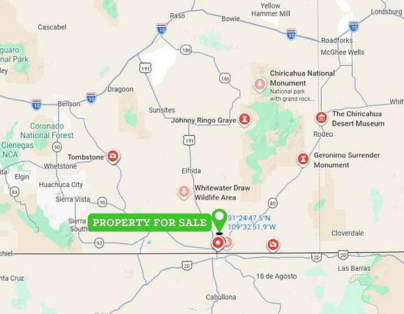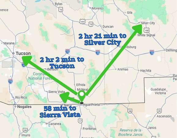 Located outside Douglas city limits under Cochise County jurisdiction, the property sits approximately 9 minutes from Douglas for grocery stores, schools, restaurants, and everyday services, 36 minutes from Bisbee's historic district, and about 2 hours from Tucson's major amenities. Southeastern Arizona's open landscapes, mountain views, clear skies, and growing residential development attract buyers seeking less crowded settings while maintaining connection to nearby towns and services.