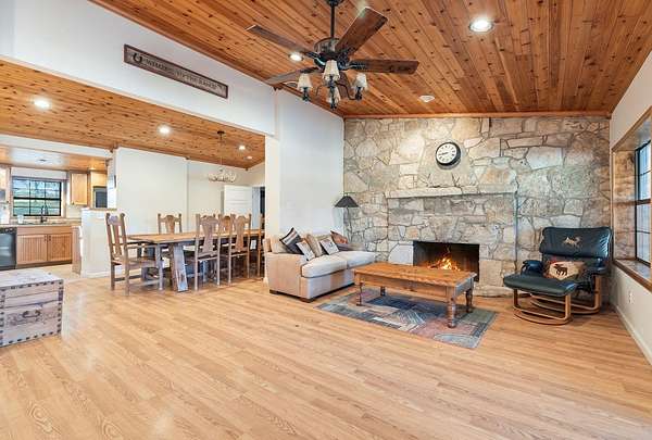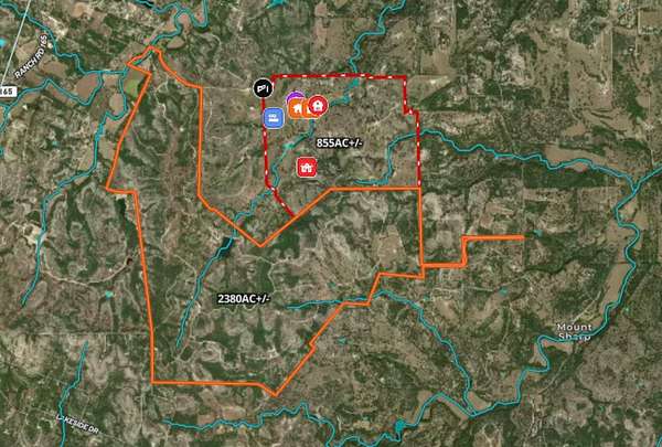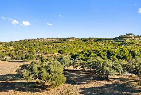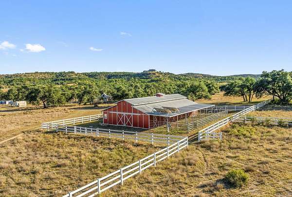 Extraordinary 855-acre live-water ranch in the heart of the Texas Hill Country, located 15 minutes west of Dripping Springs, 2.5 miles from Highway 290, & approximately 45 minutes from downtown Austin. The property features nearly 1.5 miles of spring-fed Mustang Creek, flowing year-round-even in drought conditions-& dammed to create multiple deep lakes ideal for fishing, swimming, & paddleboarding. The renowned vineyard region (between Johnson City & Fredericksburg) is just 30 minutes away, as well as Wimberley. The land showcases dramatic elevation changes, with rolling valleys and commanding hilltops that deliver sweeping panoramic views in every direction. Crowning one of these hilltops is a 7,000 sq ft custom residence offering six bedrooms & seven bathrooms, thoughtfully upgraded with new hardwood floors, a fully updated kitchen, an elevator, a dedicated wine room, & a Savant AV control system. Outdoor living is equally impressive, with a negative-edge pool & expansive entertaining areas that take full advantage of the surrounding vistas. Privacy is paramount, with access provided by a gated, one-mile private paved road, & the entire ranch is high fenced. A large pond greets you at the entrance, & wildlife is abundant throughout the property. The ranch is managed under a wildlife plan and includes 10 deer feeders, six turkey feeders, & six established food plots, supporting a thriving habitat. Additional improvements near the creek include a two-bedroom, one-bath foreman's house, a rustic three-bedroom, two-bath guest home, a well-designed equestrian facility, & a large equipment barn. Whether envisioned as a recreational retreat, hunting ranch, legacy estate, or private sanctuary, this property represents a rare offering that captures the very best of Texas ranch living and is a once in a generation opportunity for a ranch of this size and quality this close to Austin. Additional 2,300+/- acres available; see Agent for more information.
