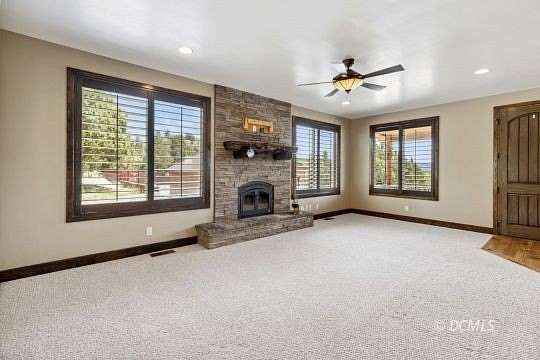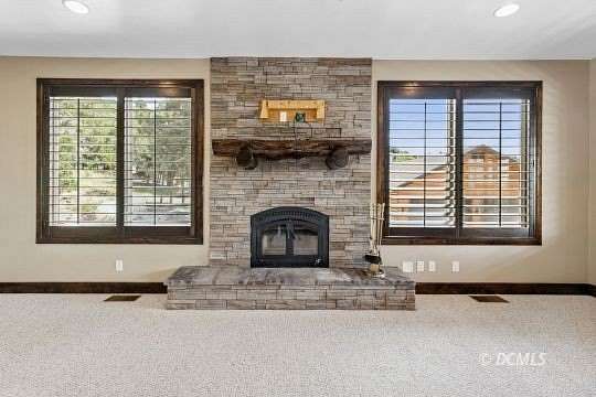 - Carpet Flooring, Ceiling Fans, Den/Office, Walk-In Closets, Window Coverings, Wood Fireplace, Wood Flooring