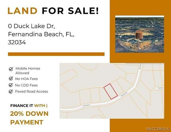 Build or Place your home on this almost Half-acre (0.45+/- acre) vacant lot located on Duck Lake Dr in Fernandina Beach, Nassau County. This property offers a great opportunity for buyers seeking space, usability, and location. Zoning allows for Mobile homes, providing options for site-built, manufactured, or investment use. The property features paved road frontage, with No HOA and No CDD fees, offering fewer restrictions and lower ongoing costs. Additional Opportunity: The Adjacent lot at 94469 Duck Lake Dr (approximately 0.49+/- acres, including a Well and Septic) is also available for purchase, giving buyers the option to own nearly 1 Acre of Side-by-Side land for expansion, added privacy, or future plans. Conveniently located approximately 20 minutes to Fernandina Beach and Amelia Island, 25-30 minutes to Jacksonville International Airport, and near Baptist Medical Center Nassau, with close proximity to shopping, dining, and everyday essentials in Yulee and Fernandina Beach. Easy access to US-17, SR-200 (A1A), and I-95 makes commuting simple. This property is ideal for buyers looking to build, invest, or secure land in a growing area of Nassau County with convenient access to major roadways and coastal destinations. Qualified buyers may purchase this property with as little as 20% down payment.