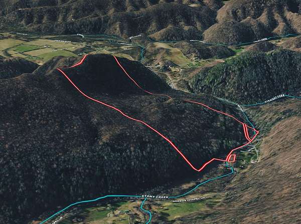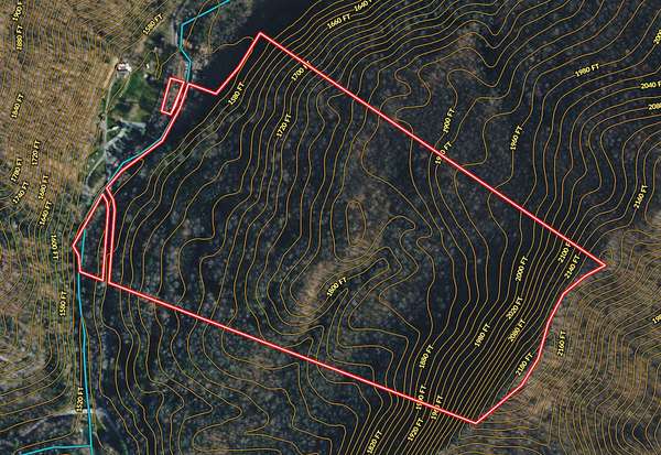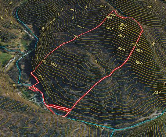 The land rises from ~1,540 ft along the creek to over 2,200 ft, offering incredible diversity. A natural saddle around 1,820 ft provides a great location for cabins, campsites, or a scenic overlook.