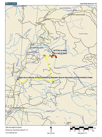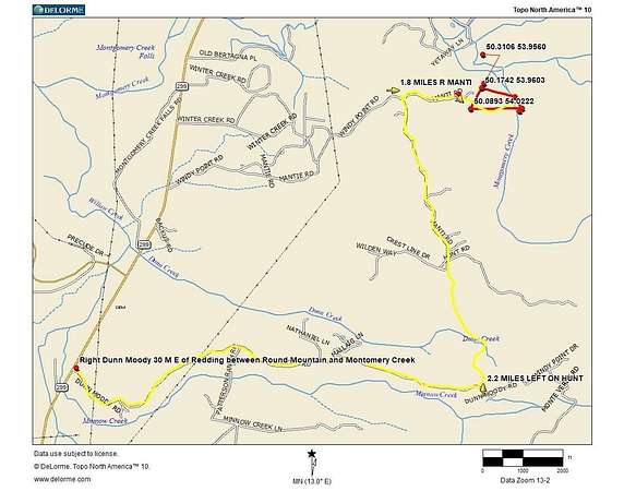 Just before Halcomb Cemetary right up Dunn Moody 3 miles to end left on Hunt 2 miles till end right Mintle 1/2 mile, at red gate, go right and drops into property