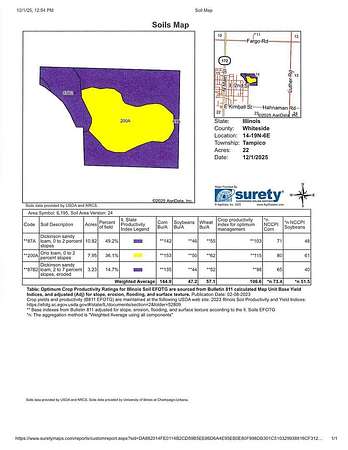 Est $1,620/mo22.1 (MOL) acres located next to the Village of Tampico. This parcel offers approximately 20 tillable acres and a Productivity Index of 106.8. The soil types on this parcel are Orio and Dickinson. There is now a lease in place for 2026. This parcel has recently been divided, therefore the 2025 taxes have not been established as of the listing date. 22.1 is the number of taxable acres stated in the Whiteside County records and not based on a survey. Asking $8,900 per acre.