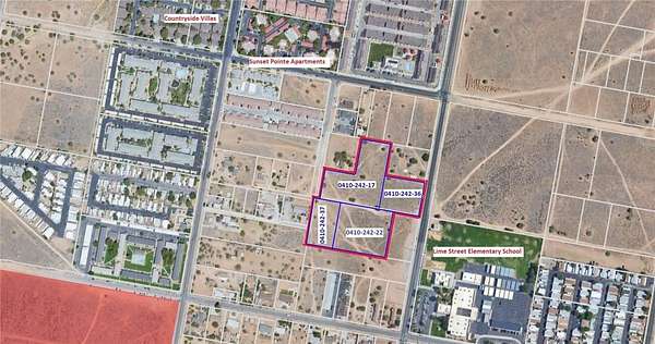 ATTENTION INVESTORS, DEVELOPERS & BUILDERS!! Substantial Price Reduction Prime Vacant Lot 6.57 acres lot on E St, zoned Medium Density Residential at GREAT LOCATION, in a rapidly development area in Hesperia, right in the center of High-End Muti-Family Housing Area, with great accessibility from both D Ave and E Ave. Walking Distance to Schools; across the street from Lime Street Elementary School, 0.8 miles from Sultana High School, 0.6 miles from Lime Street Park. Close to Main Street shopping centers, United States Post Office, fire station, restaurants, short distance to FWY I-15. The price includes 4 adjacent parcels APN 0410-242-17, 22, 36, 37 with total area of 6.57 acres.