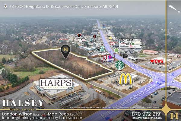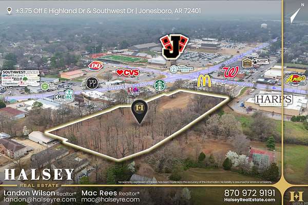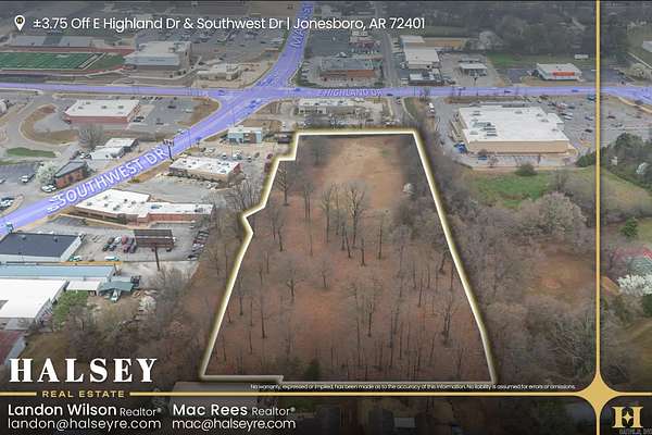 This ±3.75-acre tract just off E Highland Drive and Southwest Drive sits in a proven commercial pocket of Jonesboro where retail, service, and residential uses naturally converge. The site is tucked just off the main corridor, giving it accessibility - ideal for a range of development types. The split C-3 and R-2 zoning opens the door for multiple paths forward, whether that’s a commercial concept, residential use, or a combination of both. The layout and depth of the site allow for thoughtful design. What sets this location apart is how established the surrounding area already is. Traffic is consistent, rooftops are in place, and the surrounding businesses aren’t speculative—they’re operating and drawing daily activity. That foundation reduces the guesswork and supports long-term viability. The combination of location, zoning flexibility, and surrounding activity makes this a well-positioned site for a range of development uses within an established area of Jonesboro.