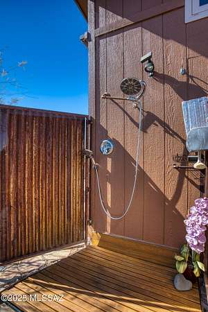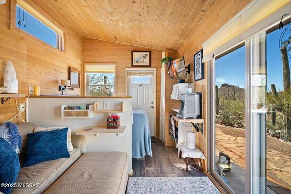 Escape to 10 acres of pristine Sonoran Desert, where towering saguaros frame panoramic views of the Owl Head Buttes. Inside a secure, solar-gated community, this property blends off-grid freedom with modern comfort. A 200 sq. ft. tiny home with cedar paneling, soaring ceilings, a propane fireplace, and a mini-split invites cozy living. The kitchen features butcher-block counters, Kraus sink, propane stove, and reverse osmosis water. Outdoors, flagstone walkways, a colored concrete patio, and an outdoor shower enhance your connection to the desert. Support buildings include a 20'x20' high-roof carport with 30-amp RV hookup, an 8'x14' insulated workshop, multiple storage sheds, and a separate 8'x16' shed housing a robust 4kW solar system, storage, and washer. With a strong well, fire mitigation in place, and room to expand, this is peaceful desert living at its finest.