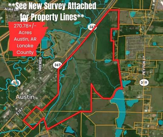 Surveyed in January 2025! Discover the perfect blend of seclusion & convenience w/ this ambitious 270.78+/- acre property, located in the sought-after Cabot School District. This recreational haven offers a variety of fully fenced landscapes- including established hay fields, hardwood forests, & two ponds (one spring-fed). 5 minutes to Cabot, residents have easy access to several amenities & a convenience to town while maintaining privacy & seclusion. It's ideal for outdoor enthusiasts w/ wildlife such as deer, turkey, & other small game. Yet prime property for developers looking to grow the city of Austin, AR. Electricity is available throughout w/ city water & sewer accessible at the street, adding modern convenience to this private retreat. Whether you're looking for a secluded getaway or considering investment/development opportunities, this property offers it all. A perfect fit for someone looking to add to the ever-growing area. Will consider subdivide.