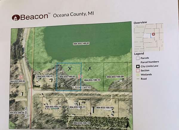 Great, secluded, private parcels with walking access to get to Rossel Lake. Your paradise right here to enjoy. Two parcels selling together. Cash only sale as is. There is an older 2'' well as is condition and Electric meter attached to a pole on the property as is. Great Lakes Energy service. You're going to want to check this property out and have your proof of funds letter ready. Must be accompanied by a Real Estate Agent to be on the property! Don't forget it is hunting season so just in case Beware. SEV, taxable, taxes are combined. Parcels-- 004-033-100-02 and 004-033-100-13 The Access to Rossel Lake is by way of a 20' private easement that runs across all parcels for ingress/egress only to the lake. See survey in photos. There is a Chain across driveway and (WALK IN ) No room back in to turn around. Buyer is responsible to verity All information.