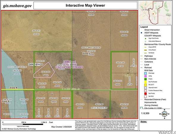 North Stockton Hill Rd. To E Buckeye Rd. Turn left and go down a 1/2 mile east to the fence, turn left to the end and that is Sweet Bush. Or keep going on Buckeye down to E Sweet Bush Rd. and follow it around to the property. Don't use E Sweet Bush to come in unless you have a 4X4 or truck to go through the wash.