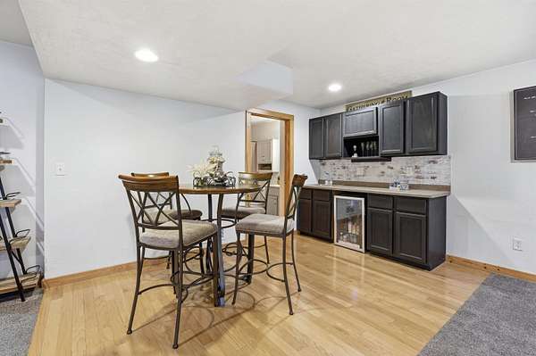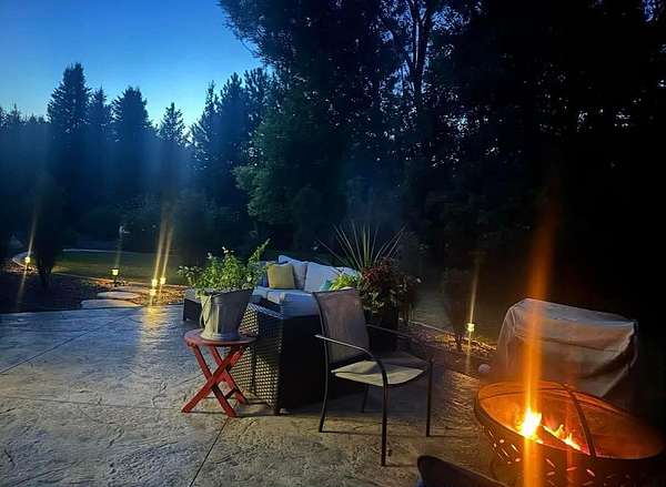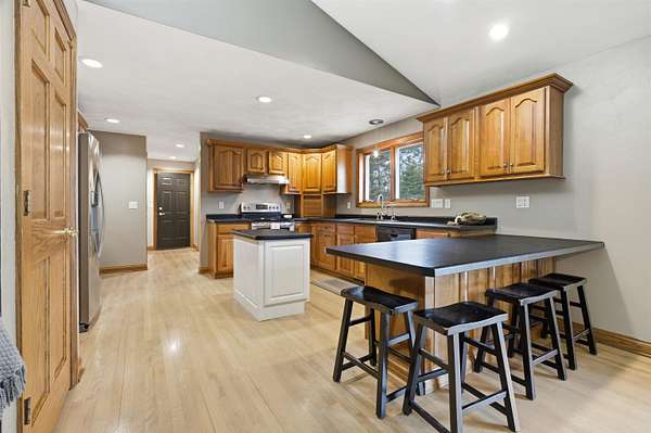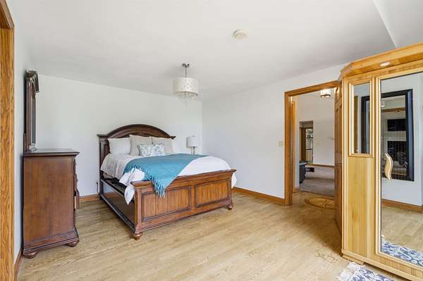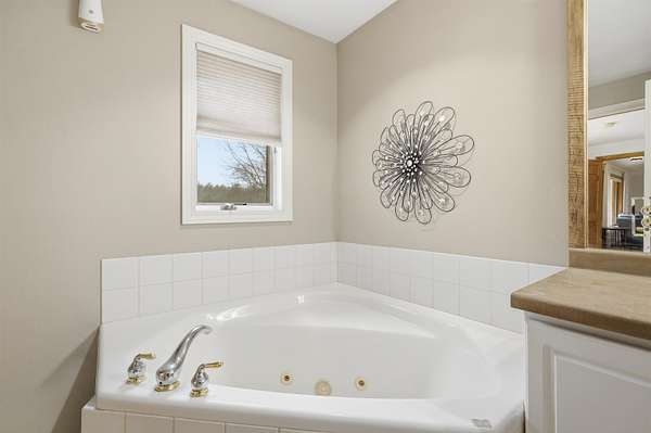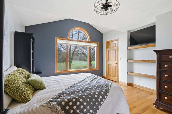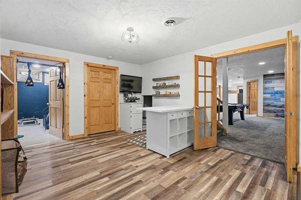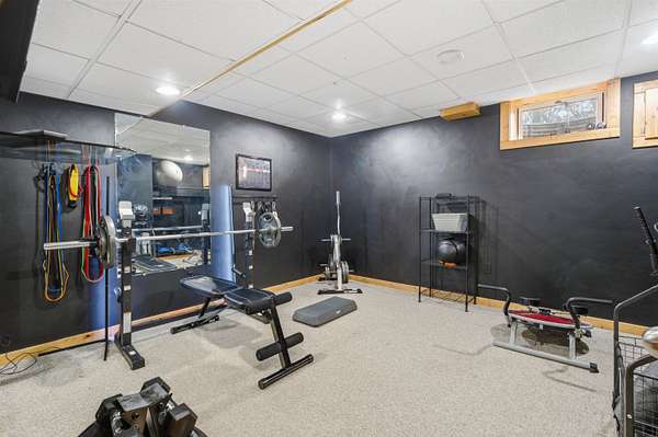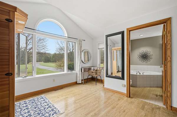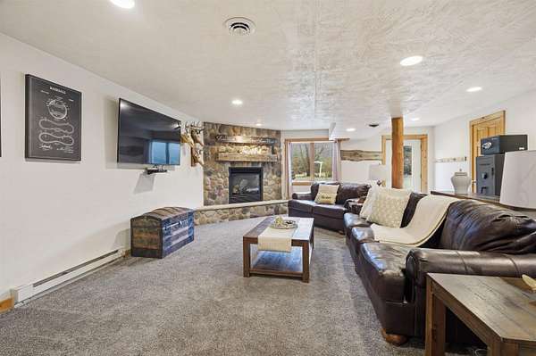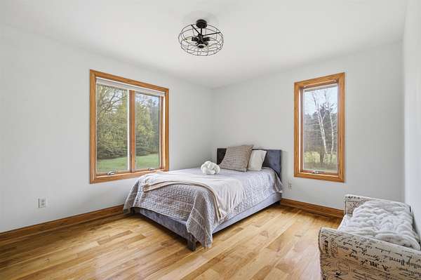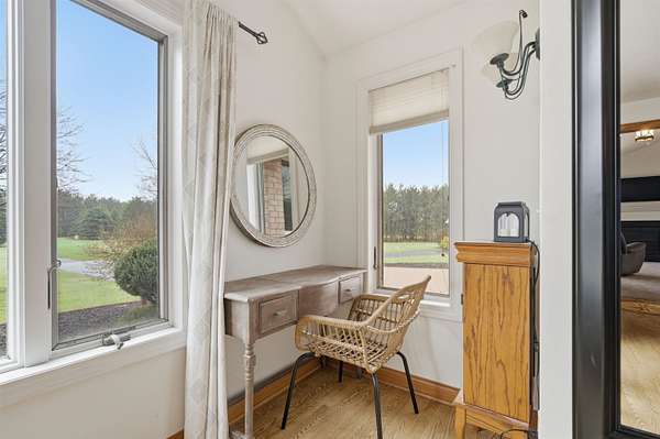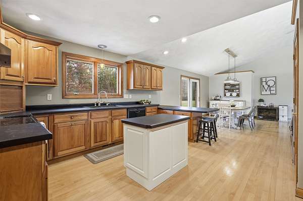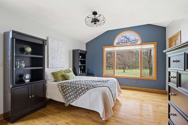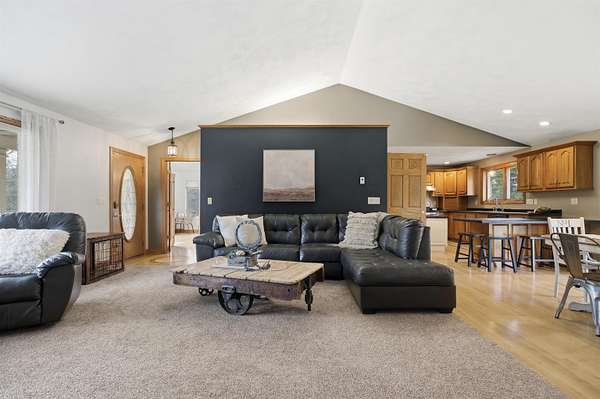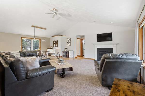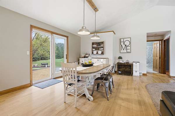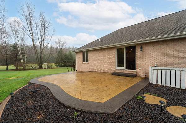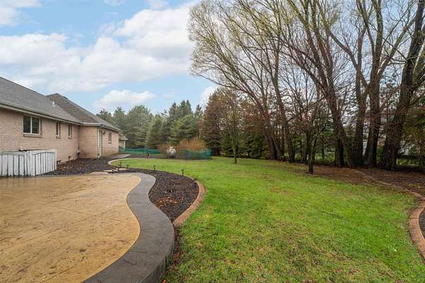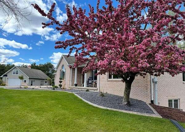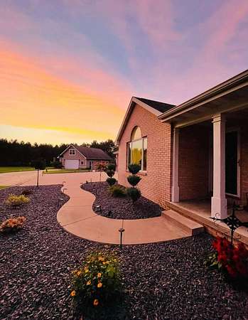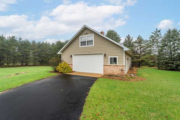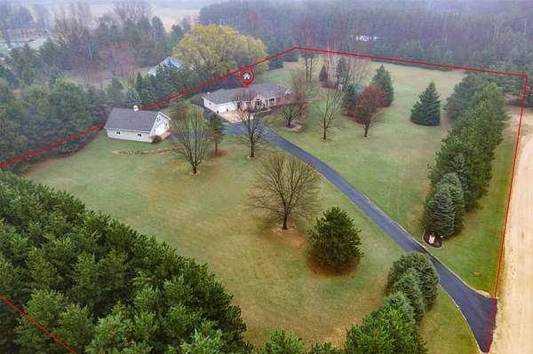 Escape to a stunning 4 BD, 3BA brick walk-out ranch nestled on 5+/- acres at the end of a cul-de-sac. Main level boasts a large kitchen, sun-drenched dining with seamless patio access, inviting living room warmed by gas fireplace. Primary with walk-in closet and full BA. 2 secondary BDS, full BA. Convenient main-level laundry and half BA. Expansive lower level features family room with fireplace and wet bar, 4th BD, 3rd full BA, craft room, and fitness space. Beyond the home, you'll find an attached 2.5-car garage and 32x40 detached garage with finished loft-perfect for hobbies or storage. Step outside to enjoy the gorgeous landscaping, a charming stamped patio, fruit trees, and abundant wildlife. Recent major updates: roof, septic, pressure tank and A/C unit. Your private oasis awaits!