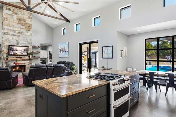 Other features include two tankless water heaters, ice maker, and a stone wood burning fireplace.