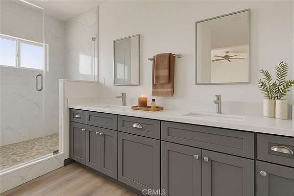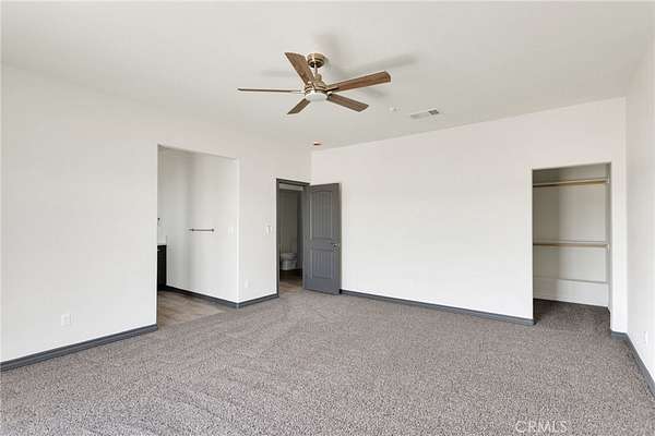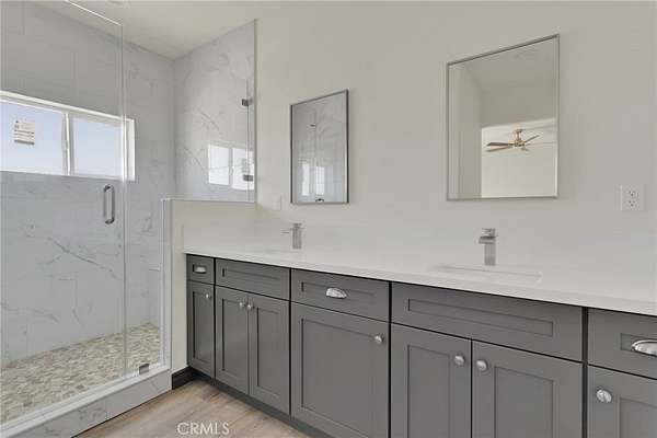 The primary suite includes a spa-inspired bathroom with a custom tile shower and a walk-in closet with built-in shelving and a dedicated shoe rack. Energy-efficient upgrades include dual-pane windows and sliders, a 5-ton HVAC system, solar panels, full Title 24 compliance, and radiant barrier roof insulation.