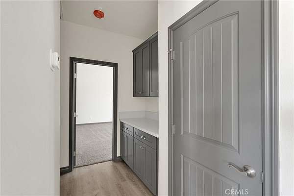 Inside, the open-concept layout showcases a clean, modern palette with contrasting dark trim, luxury vinyl plank flooring, and plush bedroom carpeting. The chef’s kitchen features gray cabinetry, soft-close drawers, custom quartz counters, and coordinated finishes carried through the bathrooms, hallway, and laundry room.