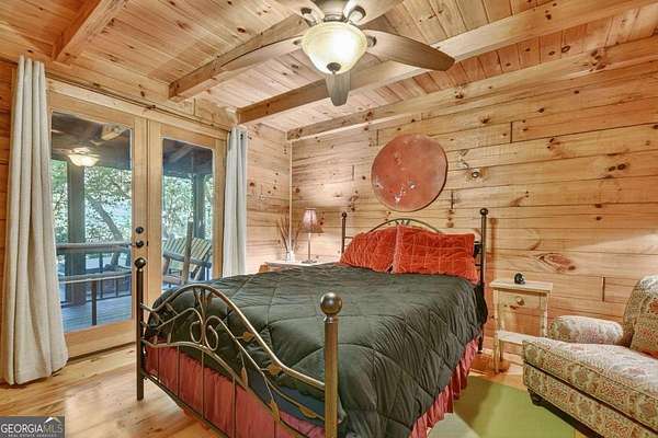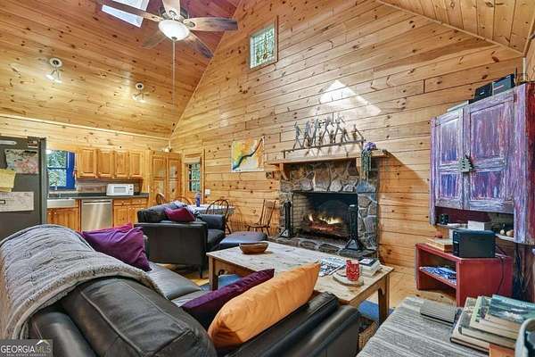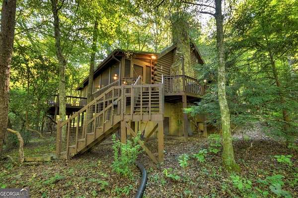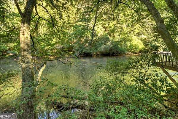 Cartecay Riverfront Log Cabin on 2 separate lots totaling 2.67 Acres - A True Mountain Retreat! Escape to tranquility with this timeless 3-bedroom, 2-bath log cabin nestled along the serene Cartecay River. Set on a sprawling 2.67-acre lot, this enchanting home offers stunning riverfront views, and the sound of gently flowing water will soothe your mind as you relax in your private sanctuary. Step inside to an open-concept living area with soaring ceilings and abundant natural light. The striking stone fireplace, equipped with gas logs but designed for wood-burning, serves as a cozy focal point. The fully equipped kitchen boasts all-new appliances and luxurious quartz countertops. The primary suite, located on the upper floor, offers generous space for the bedroom and sitting area, along with a private bath. There's potential to easily create even more privacy by enclosing this area. Two spacious bedrooms on the main level provide plenty of room for family or guests, with the main BR French doors leading out to a screened porch that captures the essence of mountain living. Fully Updated Bathroom on the main level with laundry Room. Tons of outdoor decking with a sunken hot tub area and an additional deck over the river for easy fishing. Back yard is fenced for the fur babies to roam with no worries. The property is offered with an additional lot to be used as a privacy buffer or to build your future dream home. With so much to offer and so much potential at every corner, we know you will love this home and location as much as we do! Pricing includes all furnishings excluding wall hangings and a few personal items.