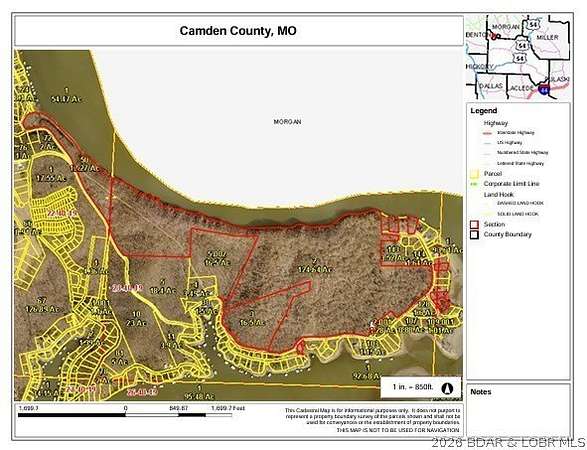 An extraordinary development opportunity in a lake area gated community. This offering includes 10 parcels totaling 154+ acres of beautifully wooded landscape with diverse terrain, ideal for creating a luxury lakefront retreat, or thoughtfully designed residential development. With over 6,000 feet of shoreline on Lake of the Ozarks, the property delivers immense waterfront potential & breathtaking views. Infrastructure is in place to jumpstart your vision-electric, waste treatment, and a water well system capable of servicing up to 75 homes. Utilities already available to 8 lots. A 100x50 barn equipped with electric, water, & sewer provides immediate functionality for storage, office space, staging, or on-site operations. To make this opportunity even more turnkey, essential development equipment: John Deere backhoe, John Deere 240 skid steer, Kubota LA805 L4060 tractor with loader and brush hog are included. Whether you envision an investment subdivision, or signature lakefront community, this property offers the scale, infrastructure, and location to bring it to life. Opportunities of this magnitude along Lake of the Ozarks are rare-explore the possibilities today.