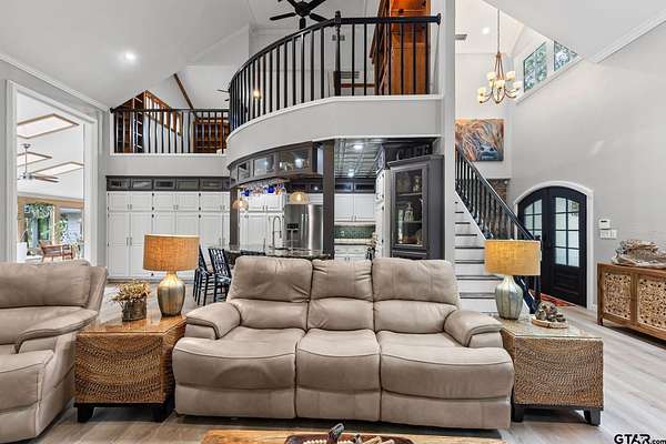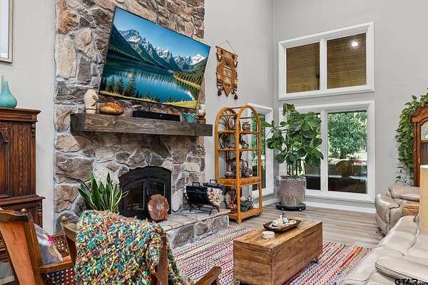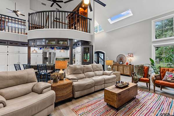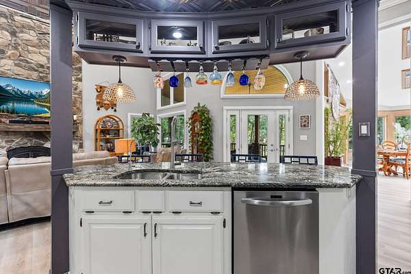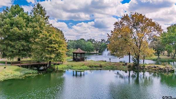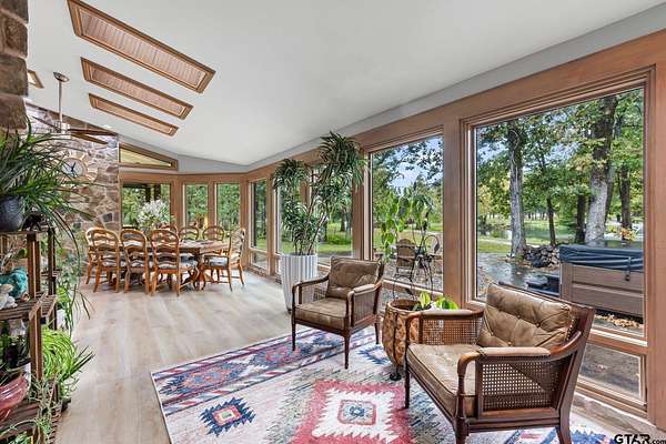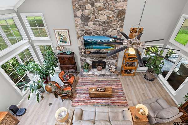 "Unique" is defined as unlike anything else, and this exceptional property embodies that meaning. Set on approximately five wooded acres in Lake Fork Country Club Estates, this rare offering provides space, privacy, and comfort in one of Lake Fork's premier subdivisions. Residents enjoy an 18-hole golf course, a private boat ramp for owners and guests, emergency helicopter access, and a convenient location near Emory, with Tyler and Dallas about an hour away. The home offers over 5,000 square feet of heated and cooled living space and sits on six lots, most fronting a private stocked pond. Inside, soaring vaulted ceilings, a floor-to-ceiling wood-burning fireplace, skylights, and walls of glass create a bright, inviting atmosphere. The open living and kitchen area overlooks the pond and features stainless steel appliances, granite countertops, pendant lighting, an antique pressed-tin ceiling, abundant storage, and a breakfast bar. A Ring security system with cameras and audio provides added peace of mind. The home includes five bedrooms, four full baths, and two half baths. Four bedrooms and three baths are on the main level. The upstairs loft functions as a fifth bedroom or private office with its own bath and closet. The primary suite offers a fireplace, built-ins, and a spa-like bath with jetted tub, glass-block shower, and large walk-in closet. Additional bedrooms include a private guest suite and a Jack-and-Jill arrangement. Above the three-bay garage is a nearly 1,100-square-foot bonus room, accessible by stairs or elevator, ideal for entertaining. Outdoors, enjoy a covered patio, a 1,450-foot walking trail with bridges and gazebo, twin pond fountains, abundant wildlife, and fishing in your own back yard has never been easier or boating on Lake Fork just minutes away. Including golf just beyond the property line, this home is truly one of a kind. Opportunities like this are rare, don't be the one who looks back wishing you had made this property yours.