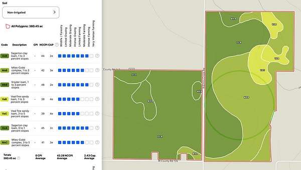 Est $5,882/moThe Walker Farm offers a well-designed and highly functional agricultural setup. The farm in its entirety is approximately 387.76 acres. The western portion consists of approximately 157.86 acres of dry-land cultivation, providing excellent tillable ground. The eastern side of the property is equipped with multiple irrigation wells, supporting a productive pivot system covering roughly 75 acres, with the balance of that section also used as dry-land farmland.n. Sellers are willing to OWNER FINANCE!