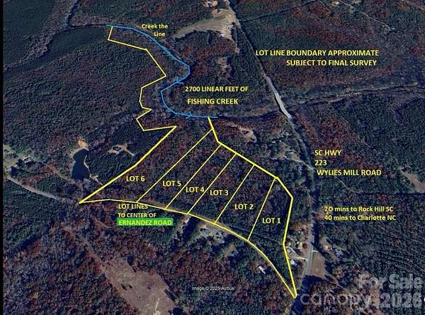 Break away from confined Neighborhood living with this +/- 5 acre lot. Located just off SC Hwy 223 on Ernandez road which is a quiet paved road. Several ideal homesites and plenty of room for a building, barn, or shop. Property consists of slight rolling terrain with mature pines and hardwoods. An abundance of wildlife from deer, turkey, rabbits, squirrels, quail, and dove. No HOA but minimum deed restrictions to ensure like-kind properties and maintain property values. Utilities such as power, cable internet (500 Mbps), and natural gas are located at the road for use. All lots that have been perked, and come with a soil report by licensed engineer for obtaining SCDEHC septic permit, making your dreams of building a reality. Conveniently located to Charlotte, Rock Hill, Lancaster, Chester, and Columbia; and within 5 minutes I-77 SC Exit 65 Richburg, SC where many public amenities are located.