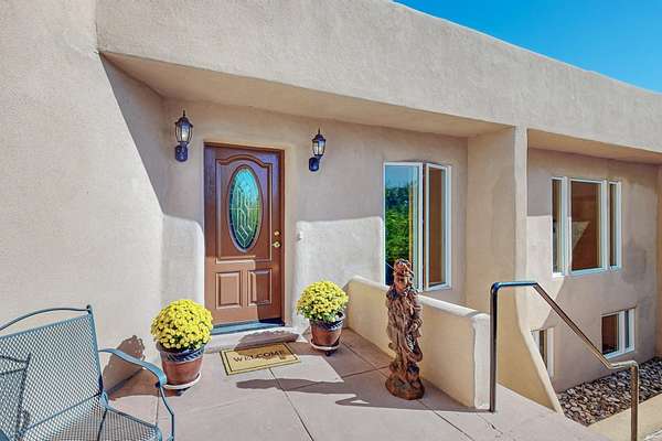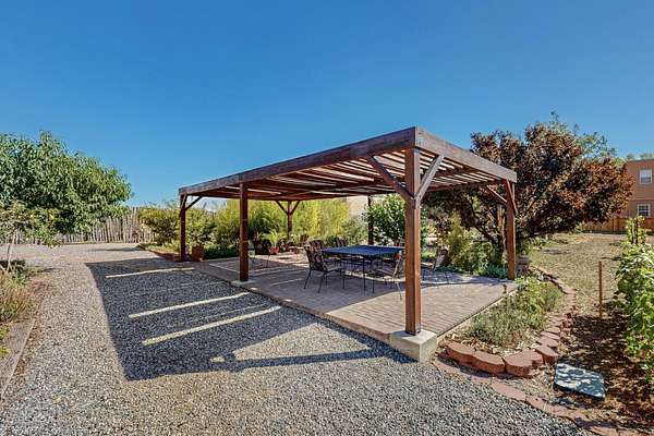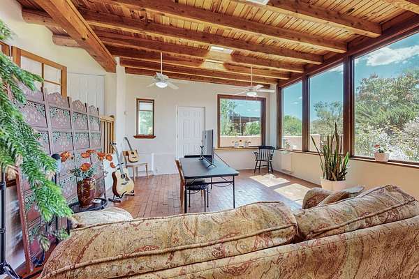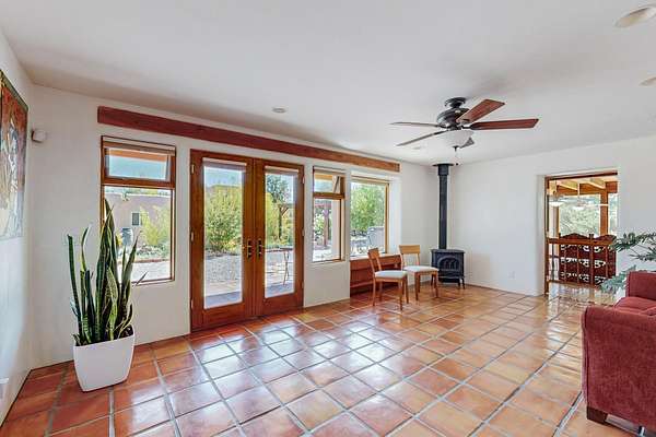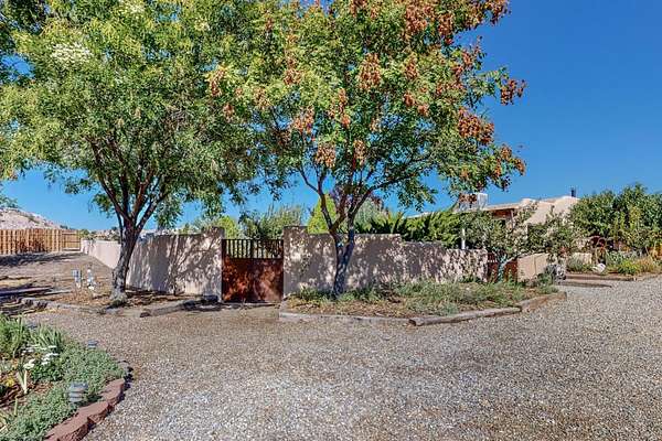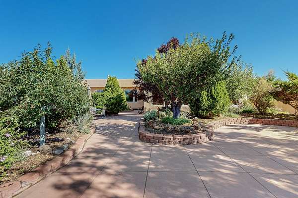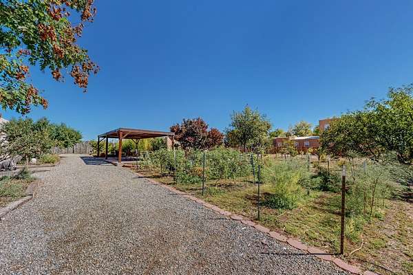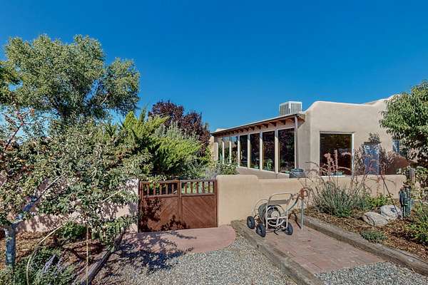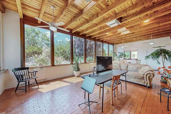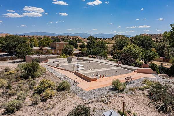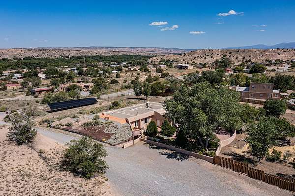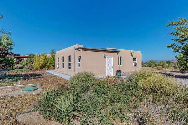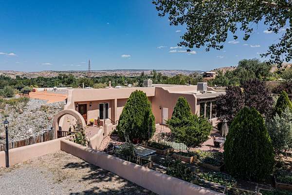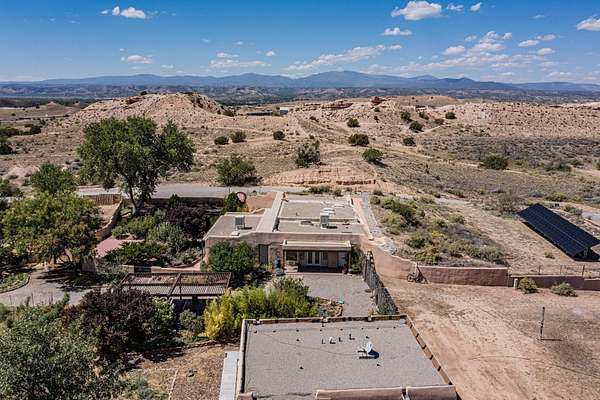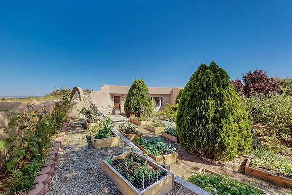 A rare offering in Northern Santa Fe County, this solar-powered berm home and guest house sit on two acres beside protected public land, where expansive views, established gardens, and access to nearby trails define the setting. Located approximately 30 minutes from Santa Fe and Los Alamos, the property blends Southwest architectural character with a thoughtfully cultivated landscape. Gardens lovingly tended for more than two decades surround the home with fruit trees, vegetables, flowering plants, and open skies. The property includes approximately 5,300 square feet of living space with a main residence and a separate guest house, offering a total of 7 bedrooms and 4 bathrooms. The guest house includes 3 bedrooms and 1 bath and may provide flexible use for guests, multi-generations, or as a rental. The south-facing main residence features an open-concept great room and kitchen with custom handmade cabinetry, skylights, traditional vigas, Saltillo tile flooring, a large walk-in pantry with full-size refrigerator, and a newer dishwasher. A spacious 700-square-foot studio/sunroom with high ceilings and 7-foot south-facing windows overlooks a courtyard garden. The main level includes one bedroom and one full bath, while the lower level offers three bedrooms, two bathrooms, and additional storage. The primary bath features a Jacuzzi tub. The main home was constructed as a solar-powered berm home which provides natural energy efficiency and stable interior temperatures throughout the year. Additional features include evaporative cooling, wall-mounted panel heaters, a Scandinavian wood stove, and a gas-powered Adobelite kiva fireplace. Outdoor spaces include expansive views, a rooftop seating area, and an established orchard and gardens supported by a 10,000-gallon rainwater catchment cistern with automated drip irrigation. A new septic tank and leach field were installed in August 2024. Zoned Traditional Community: potential for multiple dwellings or retreat center.