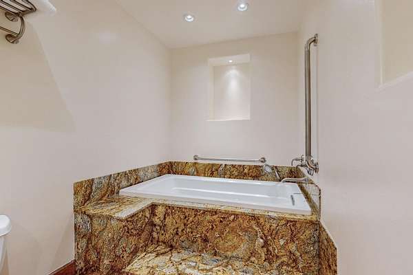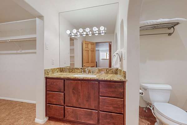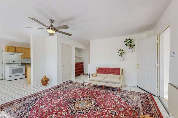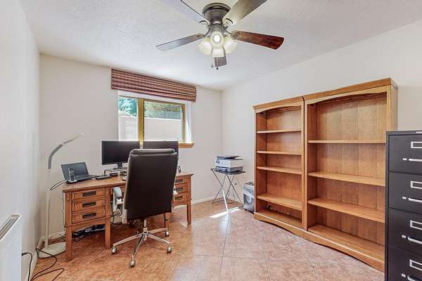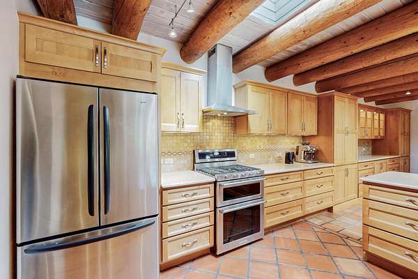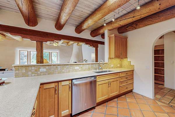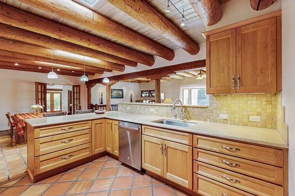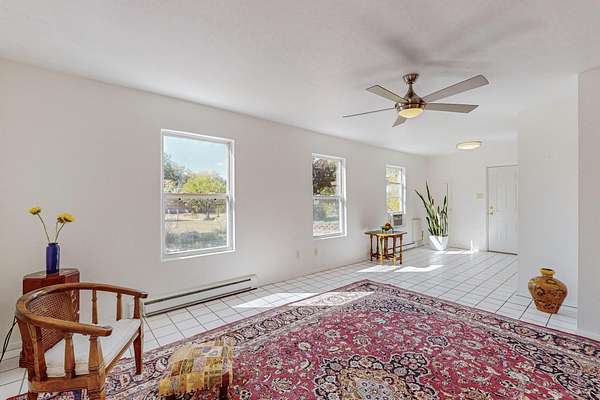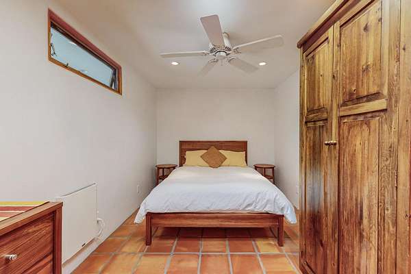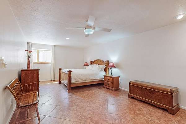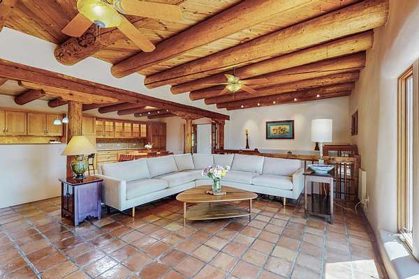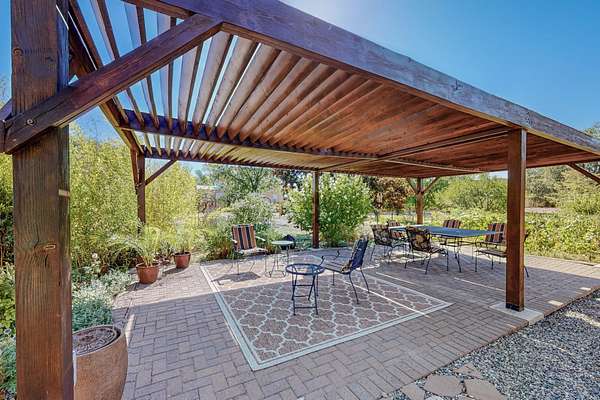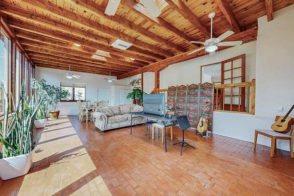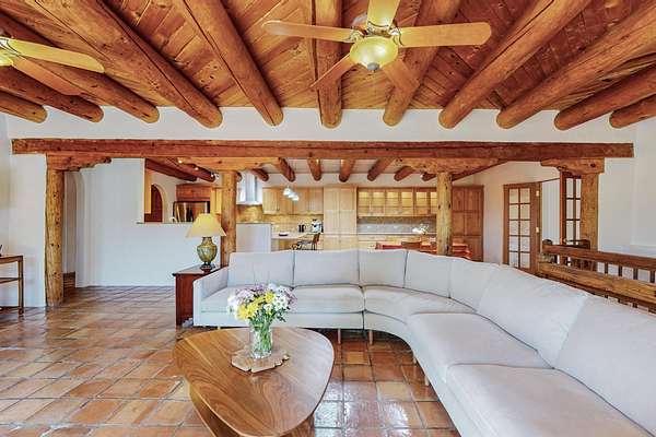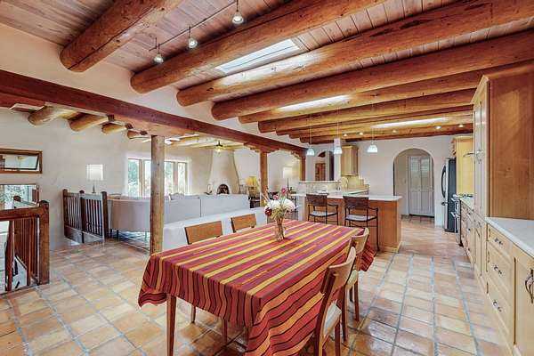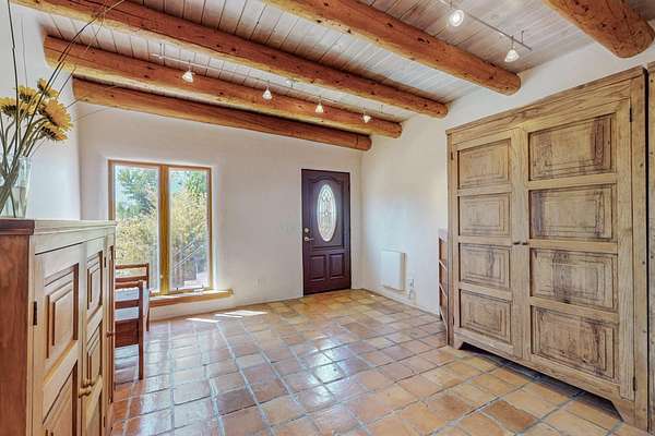 A rare offering in Northern Santa Fe County, this solar-powered berm home and guest house sit on two acres beside protected public land, where expansive views, established gardens, and access to nearby trails define the setting. Located approximately 30 minutes from Santa Fe and Los Alamos, the property blends Southwest architectural character with a thoughtfully cultivated landscape. Gardens lovingly tended for more than two decades surround the home with fruit trees, vegetables, flowering plants, and open skies. The property includes approximately 5,300 square feet of living space with a main residence and a separate guest house, offering a total of 7 bedrooms and 4 bathrooms. The guest house includes 3 bedrooms and 1 bath and may provide flexible use for guests, multi-generations, or as a rental. The south-facing main residence features an open-concept great room and kitchen with custom handmade cabinetry, skylights, traditional vigas, Saltillo tile flooring, a large walk-in pantry with full-size refrigerator, and a newer dishwasher. A spacious 700-square-foot studio/sunroom with high ceilings and 7-foot south-facing windows overlooks a courtyard garden. The main level includes one bedroom and one full bath, while the lower level offers three bedrooms, two bathrooms, and additional storage. The primary bath features a Jacuzzi tub. The main home was constructed as a solar-powered berm home which provides natural energy efficiency and stable interior temperatures throughout the year. Additional features include evaporative cooling, wall-mounted panel heaters, a Scandinavian wood stove, and a gas-powered Adobelite kiva fireplace. Outdoor spaces include expansive views, a rooftop seating area, and an established orchard and gardens supported by a 10,000-gallon rainwater catchment cistern with automated drip irrigation. A new septic tank and leach field were installed in August 2024. Zoned Traditional Community: potential for multiple dwellings or retreat center.