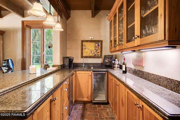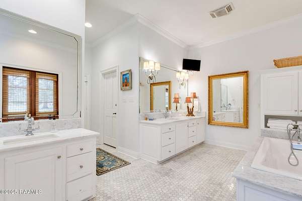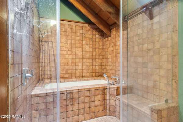 - Beamed Ceilings, Cathedral Ceiling, Cathedral Ceiling(s), Crown Molding, Double Vanity, Dual Closets, Kitchen Island, Primary Bath, Separate Shower, Soaking Tub, Standalone Tub, Tile Counters, Walk-In Closet(s), Wet Bar