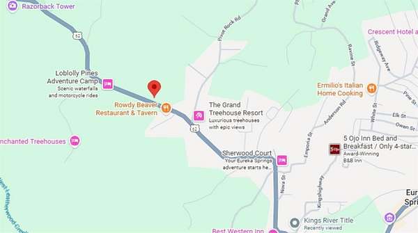 Across from The Rowdy Beaver and the entrance to Gotahold Brewery on Hwy 62, west of Eureka Springs town center.