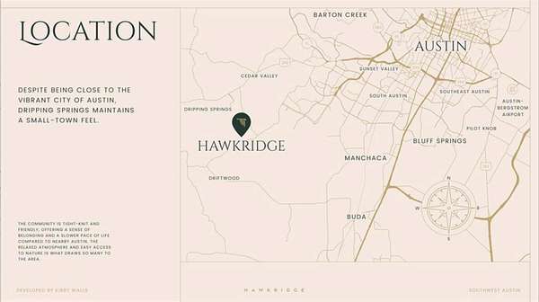 Tucked inside the Hill Country at the edge of Austin, Hawkridge offers a rare blend of refined living and natural beauty. This gated community brings space, privacy, and a connection to nature without sacrificing convenience. From here, you're just a short drive to Austin's top restaurants, music, and culture-or head the other way to explore wineries, trails, and the wide-open beauty of the hills. Each lot provides room to design a one-of-a-kind home surrounded by mature trees and scenic views. With a low tax rate and thoughtful planning throughout, Hawkridge is where peaceful living meets everyday possibility.