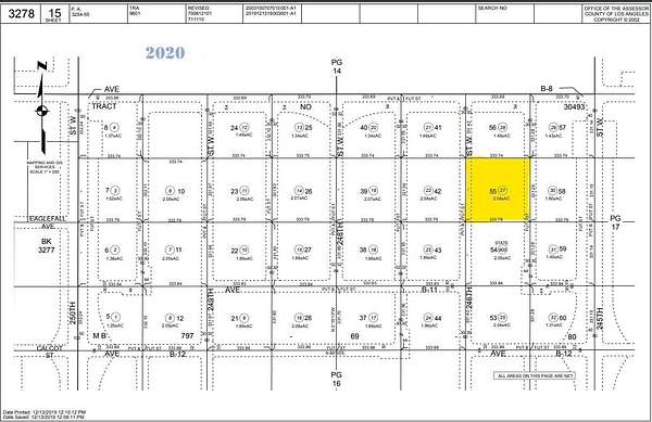 Est $139/mo2.56 acre lot in the Fairmont area west of Lancaster and roughly 13.5 miles east of Interstate 5. APN 3278-015-027. Property has had a survey and corners marked. Zoned for agriculture, animals, and a home. Start your ranch. Legal access on the map off of two streets.