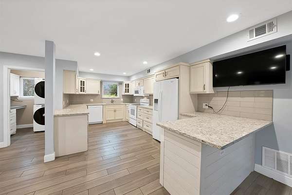 The property features four bedrooms and two remodeled bathrooms, along with a newly remodeled kitchen. Recent updates include recently replaced windows, a new metal roof and gutters, a recently replaced HVAC system, and water heater. Carpet has been replaced with durable ceramic tile throughout. Primary Bath features double sinks, walk in shower and huge walk in closet. Kitchen features granite countertops, breakfast bar and white appliances. All appliances remain with the home including refrigerator and washer and dryer.