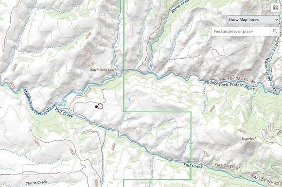 From Council head south on Hwy 95, turn east on Middle Fork Rd, go five miles, turn right on Fall Creek Rd, go over bridge, then 1/4 of a mile to property, gate will be on the left.