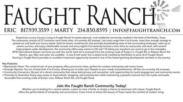 Experience Luxury Country Living at Faught Ranch! A master-planned, rural residential community nestled in the heart of Northlake, Texas.