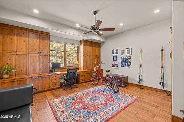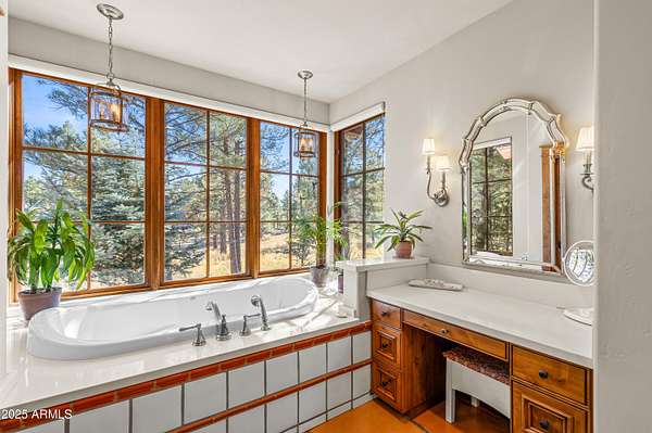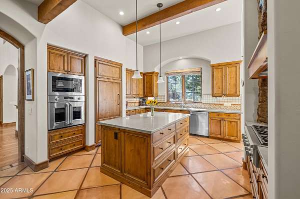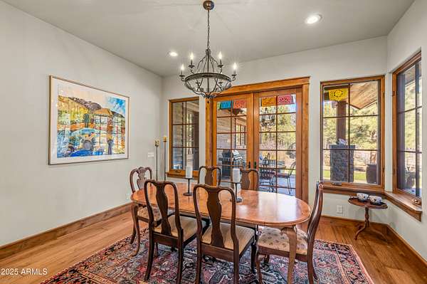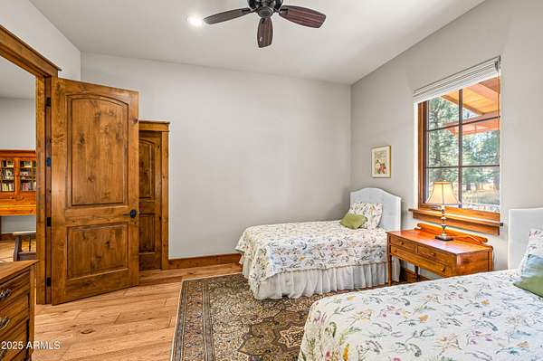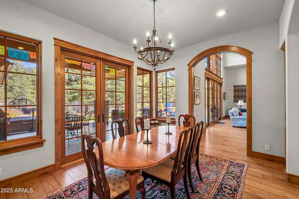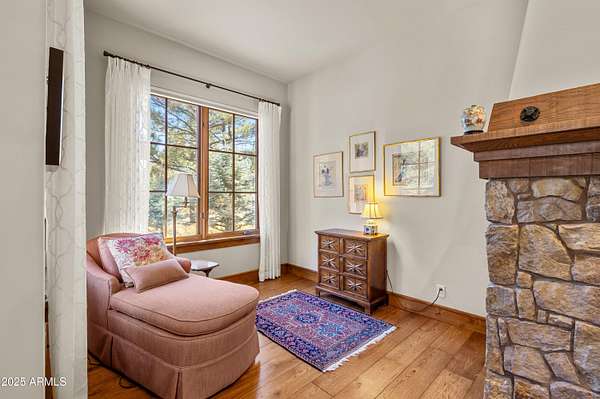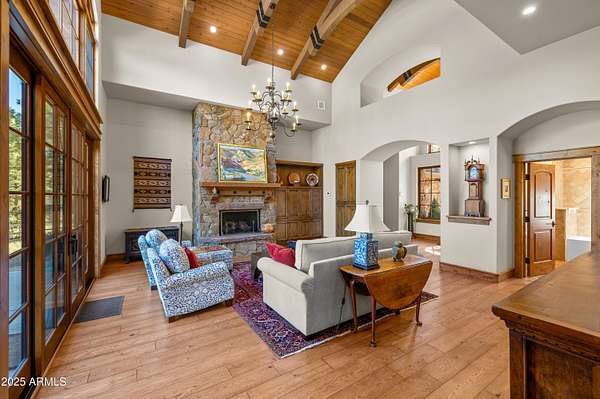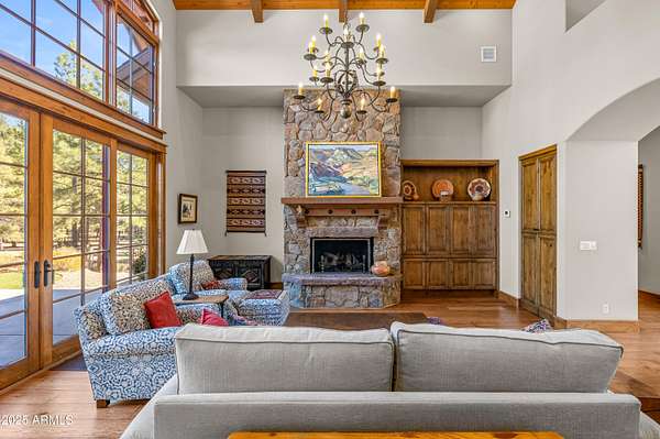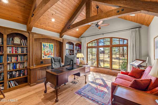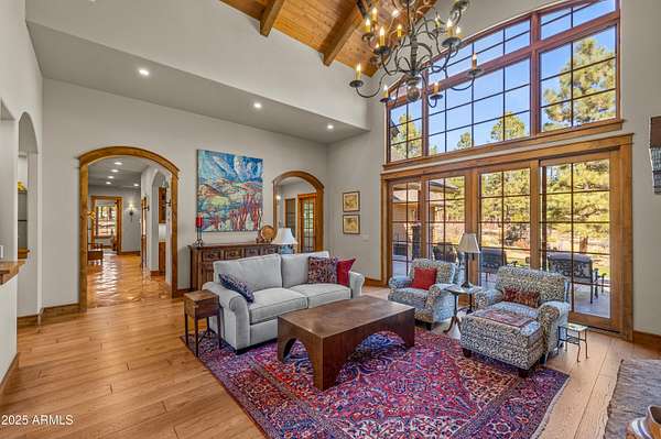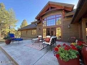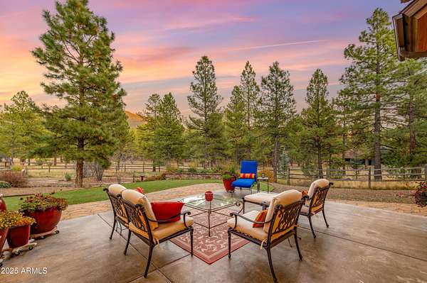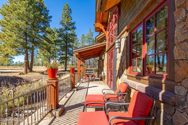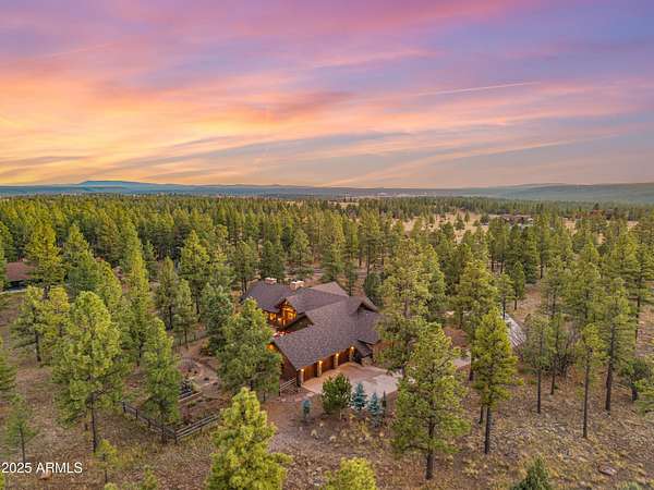 When the owners first wandered across this 4.4-acre homesite in Lockett Ranches, they felt the land speak-its sweeping pines, its quiet strength, its breathtaking beauty. Moved by that moment, they shared their vision with architect Christopher Alexander and together they shaped a home that rises from the landscape like a piece of art-luxurious yet grounded, rustic yet refined, infused with the soul of the Southwest. 550 Hattie Greene is a uniquely stunning single-level home on 4.24 forested and meadowed acres. Built by Flagstaff premier custom home builder, Harmony Builders, it is a blend of rustic luxury and traditional southwest charm. With 4 bedrooms, 4 bathrooms, radiant heat, a 3-car garage and a shared, deep-aquifer well, it's a magnificent home, mountain retreat or equestrian estate. A facade of malpais stone, bold timber beams, and vivid red windows welcome you with a presence both timeless and unique, even among the fine custom homes that surround it. Step into the great room and the outside pours in: colorful gardens, tall pines, light spilling generously through a wall of glass. Every detail throughout the home reveals the careful hand of an artisan - wide beam wood and terra-cotta floors, sculptural millwork, dramatic ceilings, gentle archways, and Southwest tilework that brings warmth, texture, and story to each room. At the heart of the home, the kitchen is warm and inviting,with its central island and breakfast nook, custom southwest tile accents and a stove with a rock-surround vent hood that stands as a beautiful tribute to the land that inspired it all. The spacious primary suite is a sanctuary where light dapples across a peaceful sitting area. Two additional ensuite bedrooms offer comfort and privacy for family and friends. Mirroring offices with built-ins and large windows are peaceful havens for work, exercise, yoga or art. One office is also designed as a fourth bedroom. Perfect. On the private back patio, the forest opens wide. Here, beyond vibrant gardens, the pines whisper in the mountain air. Mountains rise in the distance, their silhouettes shifting with each passing hour -blue at dawn, golden by late afternoon, and violet as evening settles in. This outdoor haven is a place to breathe deeply, relax, and entertain while deer and elk wander quietly through. It is a space where home and the land meet in perfect harmony, offering quiet mornings, star-drenched nights, and an ever-present sense of peace.