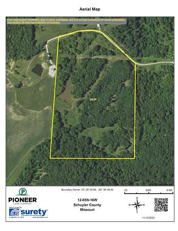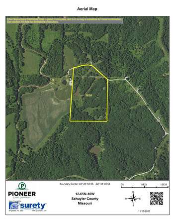 Est $1,505/moThis 34.56 acres is located in an excellent area of Schuyler County, Missouri! The property is bordered by big timber with bottom ground tillable fields to the West & is loaded with deer & turkey! Located at the end of a dead end road, the property is secluded while at the same time very accessible. Electricity, Rural water, and Fiber Optic Cable at the road bordering the property. Property has building site possibilities. There is a nice pond located on the property. Food plots planted on the bottom ground for the wildlife! Looking for a great recreational property in Northern Missouri give us a call!