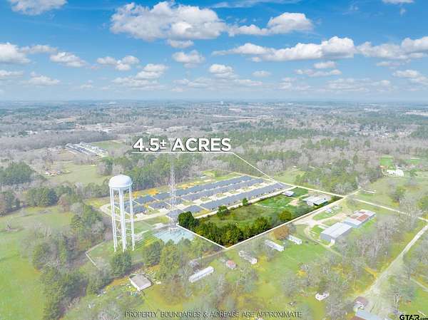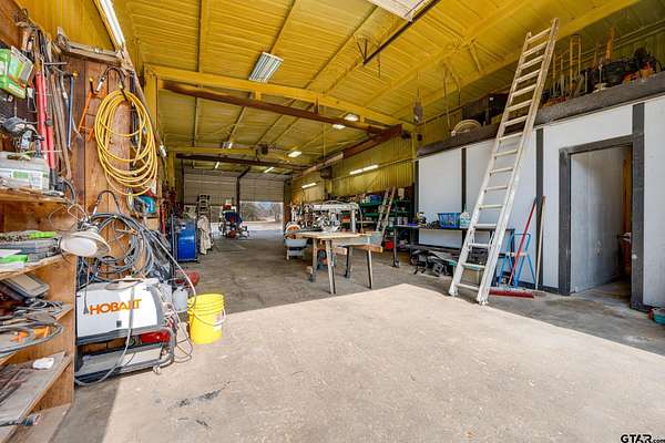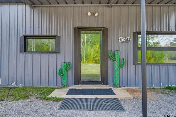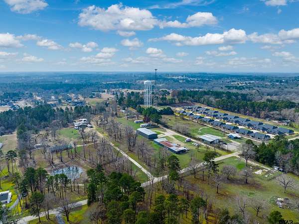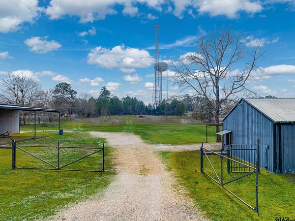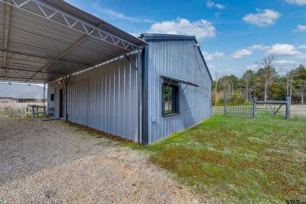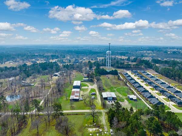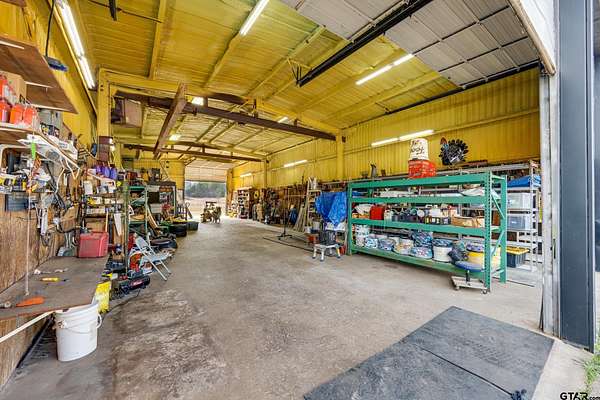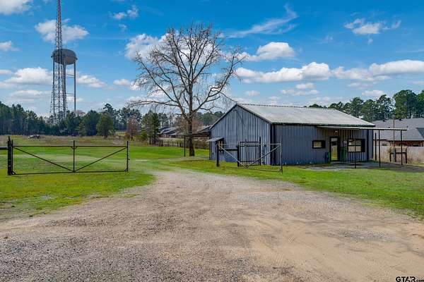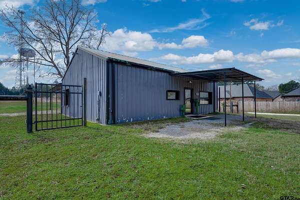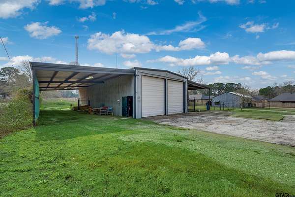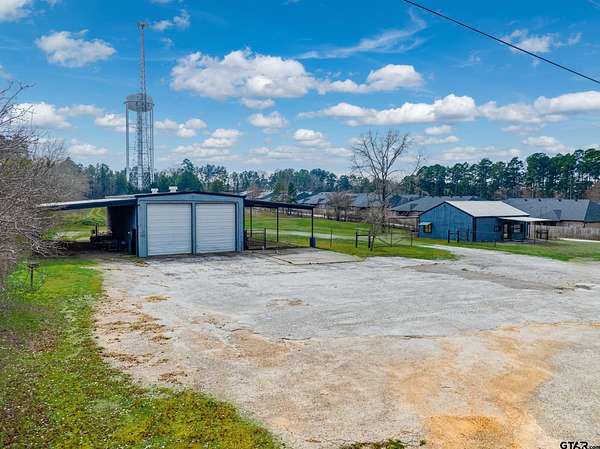 Exceptional commercial opportunity in rapidly expanding south Tyler! Situated on approximately 4.587 acres, this versatile property is ideal for contractors, service-based businesses, or operations requiring office, warehouse, and equipment storage in one convenient location. The 960+- sq. ft. heated and cooled office building offers a professional yet functional layout featuring a spacious lobby/reception area, private office, bathroom, and kitchen/break area. Stained concrete floors throughout provide a modern look with easy maintenance and long-term durability. A covered rear carport adds convenience for staff or company vehicles. Supporting the operation is a 3,200+- sq. ft. shop with three 14-foot overhead doors, allowing easy access for large trucks, trailers, or equipment. The shop also includes a secured storage area and bathroom, offering added functionality and security. Two expansive 25' x 80' sheds provide substantial covered space for equipment, fleet vehicles, or materials. With ample room for expansion, outdoor storage, and maneuverability, this property delivers flexibility and efficiency in a high-demand growth corridor. A rare opportunity to secure acreage, office, shop, and covered storage all in one strategic location, just south of Tyler.