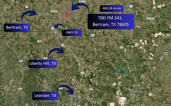 This 316.93-acre property offers immense potential for a transformative community development project. It is conveniently accessible from County Road 276 and FM 243, providing seamless connectivity to the surrounding areas. The location is ideal for creating a thriving neighborhood. The property has access to electricity and two water wells, which lay a strong foundation for sustainable living. It's strategically located, situated 5 miles from the bustling hub of Bertram, 17.9 miles from Burnet County, 15.1 miles from Liberty Hill, 26 miles from Leander, and within convenient distances of other towns and cities. Preliminary work is in progress. An investigation into 1223 Living Unit Equivalents (LUEs) indicates high-density neighborhood development potential, promising significant returns on investment. Additional acreage available.
