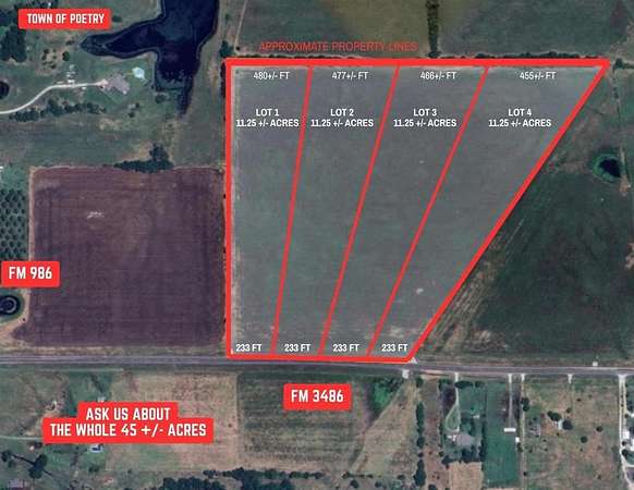 Rare opportunity to own 11.28 (+ or -) acre lot to build out your forever ranchette. There are 4 to choose from and located in the Poetry area which has developed into a sought after community half way between I 30 and I 20 convienent for commuters or trips to the airport. These lots were thought out and divided with care to include a house and 1 acre plus 10 for an agricultural use if desired. The property is currently under hay production. The sellers have already surveyed out 4 large lots to choose from and water, electric are available at the road for each lot. We have included a virtual example of what your vision might look like on lots 1-4. Now is the time to make it yours, call for more information. Septic required for each lot bring your builder take a look! Photos with homes and buildings have been virtually displayed and do not exist to easier visualize the properties possibilities.