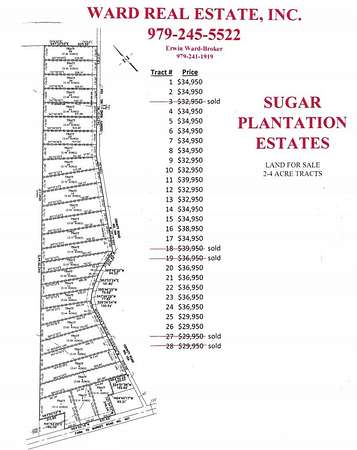 Est $253/moCedar Lane area residential development offers prospective buyers deed restricted acreage that's part of Matagorda County history. Sugar Plantation Estates is a 76-acre subdivision that was once part of the historic Bowie Plantation that was started in the early 1850s. Conveniently located close to Chevron Phillips, Tenaris, STP, Bay City, West Columbia, Brazoria & Lake Jackson. In Van Vleck ISD.