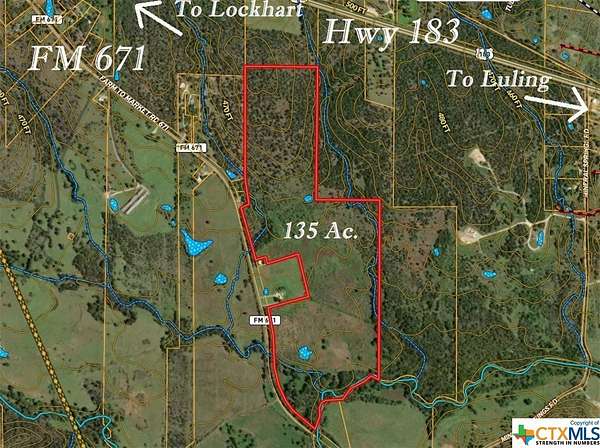 135.45 Acres just south of Lockhart (approximately 7 miles). Owner will consider selling in smaller tracts (20+ acres) Lots of possibilities here. Nice property with 2,650+ feet of paved road frontage on FM 671. Wildlife exemption in place. 3 ponds, fenced perimeter, frontage along west fork creek on the southern edge pecan bottom. Variety of trees including oak, mesquite, pecan, and more. Additional acreage (under a separate listing) available to connect property to Hwy 183. Water and Electric available nearby (buyer to verify availability and capacity). Septic systems required at this location. Owner intends to retain mineral rights, commercial water rights, and may impose some deed restrictions.