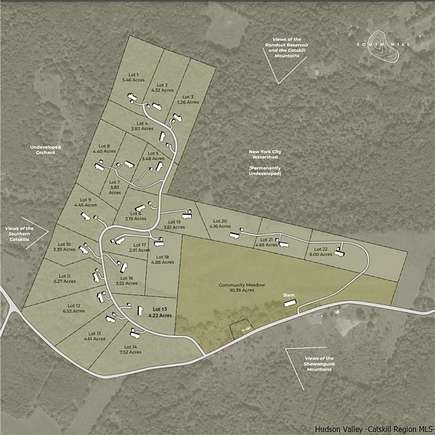 Welcome to South Hill, a modern community with luxurious homes immersed in the Catskills. Located in Ulster County, South Hill is at the forefront of a new generation of Upstate homes. Designed by the award winning architects at Mapos, each home is inspired by the dynamic landscape of South Hill and has been crafted with the utmost attention to detail while allowing you a high degree of control to make this your home. The Woodland is a 2000 square foot home designed with clean and modern finishes, natural textures, local materials, super-insulated walls and roof for low maintenance, environmental impact and energy usage. This single-story home integrates with the natural landscape and is offered on one of the largest lots - 7 wooded hickory and hemlock acres with frontage on South Hill Rd and Red Rock Road. Featuring a large and open Living/Dining/Kitchen space with 12.5 ft ceilings for gatherings. Two bedrooms can be found off of the corridor and across to a full bathroom and separate laundry room and mechanical space. The main bedroom and bathroom suite is placed at the opposite end of the home and opens onto the landscape. The home includes double pane insulated windows, finished concrete floors, chrome Kohler Purist fixtures, minimal cassette heating and cooling, and a storage attic. The exterior has stained knotty pine siding and a standing seam metal roof. Add-on amenities include a 550 sq ft guest house, a detached 2-car garage (or 1-car garage and studio), in-ground swimming pool, wood-fired sauna, outdoor kitchen, outdoor shower and a firepit. Located less than 2 hours from New York City, South Hill is optimal for weekend getaways, 4-season adventures, or a lifetime. Offering this new construction opportunity to build your home on a property with some of the most breathtaking views in the Hudson Valley. Access to 30 acres of common open space and a community barn . A full brochure is available.