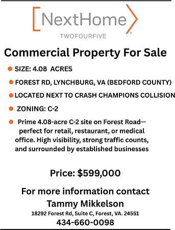 Est $4,414/moCheck out this opportunity to purchase a 4.08-acre parcel located on Rt. 221, Forest Road in the Lynchburg area with Bedford County, VA taxes. The property is zoned C-2 (General Commercial), allowing for a variety of commercial uses including retail, office or mixed-use development. The site offers high visibility & strong traffic counts, providing excellent exposure along a major corridor. The seller has had the lot cleared to provide easier access and preparation for future development.
