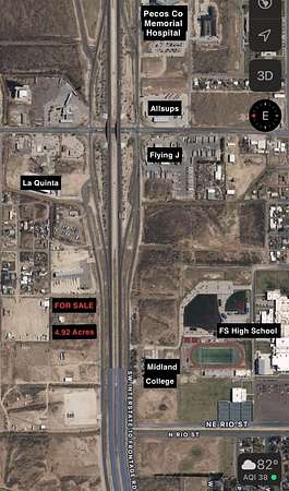Est $8,190/moPRIME LOCATION! HIGH TRAFFIC AREA! This corner lot is located near the on/off ramp of Interstate 10 and HWY 18. Conveniently located near Pilot Flying J Travel Center, Allsups, Pecos County Memorial Hospital, & the WRTTC Midland College. Property sits on a corner lot that is completely fenced, measures approx 5 acres, & has 2 water wells. This vacant land is ready for any type of commercial business. The possibilities are endless!
