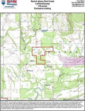 Four Corners Road 110 LOCATION: LeFlore County, Southeast OK., approximately 5 miles south of Milton. Property is less than 4 hrs from Dallas, 3 hrs-OKC, 2hrs-Tulsa. In an area of SE Oklahoma with premier cattle ranches. SITE: 110 acres m/l of a blend of pasture and woodland offering the perfect blend for grazing and wildlife habitat. Nearly level to moderately sloping terrain. Great building location and is secluded from the city life. UTILITES-Electric, phone. COVER: Estimate 75% open for pasture with a mixture of bermuda, clovers and native. Timber left in crucial places to assure plenty of shade as well as wildlife enhancement. ACCESS: County road to property. MINERALS: none. IMPROVEMENTS: Good perimeter and cross fencing allowing for ease in working cattle. WATER/STREAMS: 3 ponds, wet weather stream drainage. WILDLIFE: Area of excellent deer hunting. Excellent dedicated cover on property to support wildlife, including several bald eagles. COMMENTS: This has been a longtime family cattle operation and is a very desirable unit. The terrain is diverse to a degree of aesthetic pleasure, yet remains fully productive. Excellent location with the soils and terrain offering idea pasture and hay conditions. For an operation with productivity, efficiency and the rural way of life in mind, give us a call!