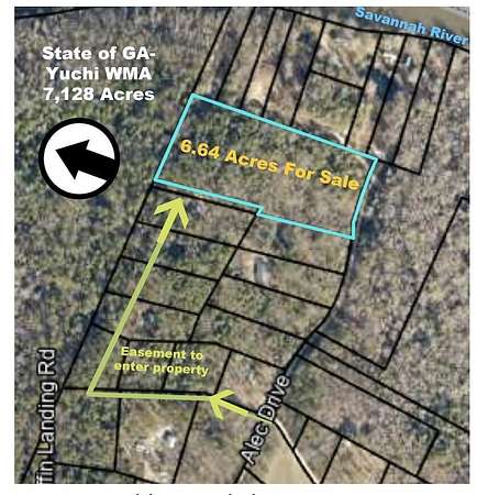 Est $444/moGorgeous 6.64 Acre tract, close to the Savannah River and adjacent to State of GA's Yuchi Wildlife Management Area. Land is located in ''On the River'' neighborhood and very close to the GA Power public Boat Ramp. This high sitting land is wooded with a dirt road easement to the rear portion. A nice flat potential building site sits atop a crest with native hardwoods and beautiful views. Land would make a great spot for new construction, mobile home, or even an RV for hunting or commuting (just 4 miles to Vogtle). Very quiet and secluded location with easy access to the river.