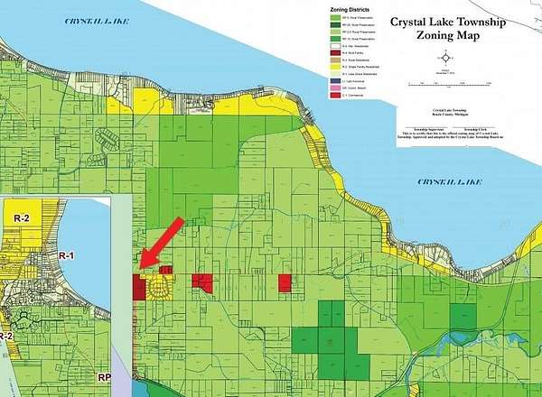Zoning per Crystal Lake Township Zoning Map accommodates approximately 4.3 units per acre, or potentially 71 units total, with no limit on unit count per building. All utilities available via City of Frankfort (water and sewer lines stop at west edge of parcel). Easy access to adjacent downtown Frankfort; very marketable site for future residents. Potential lake views on portions of site; site lines to Betsie Lake and Lake Michigan from NE section of site. Only 5-minute drive time to the beautiful white sands of Frankfort Public Beach, featuring a pierhead and historic lighthouse.