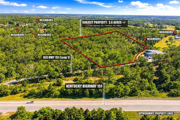 Looking for versatile land in Frankfort, Ky with development potential and convenient access? This 3.6-acre parcel offers approximate 170 feet of paved frontage off Old Highway 151 (Loop1) and an additional 265 feet along a private dirt road. The property is flat and wooded, allowing manageable site preparation while maintaining privacy, yet it is surrounding by neighboring developments and improvements. A small seasonal creek appears to run across the tract (buyer to verify), adding natural character. The layout supports a custom homesite, recreational use, or a long-term investment strategy. Parcels of this size with strong road frontage are limited in this area, especially as development continues to expand. Located minutes from downtown Frankfort, the Kentucky State Capital, and I-64, the property offers convenient access to Lexington and Louisville. Nearby outdoor recreation includes the Kentucky River, Cove Spring Park, and Lakeview Park. Whether you're seeking buildable land or an investment property in Franklin County, this property offers access, location, and long-term potential!