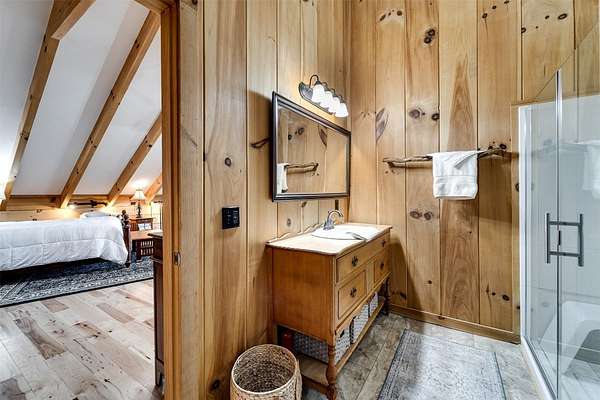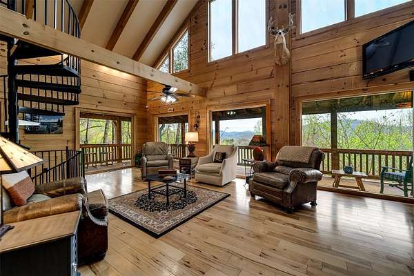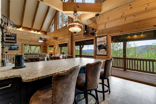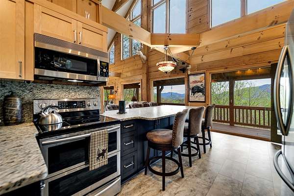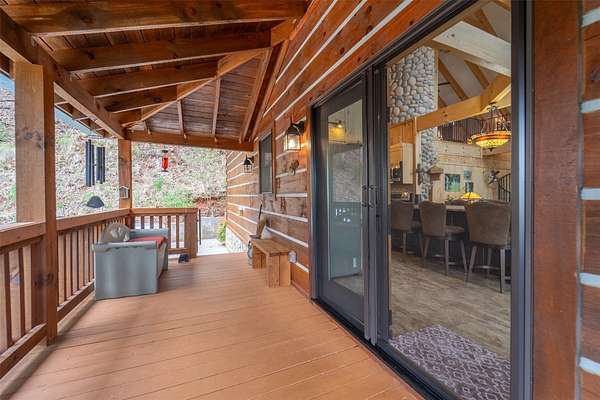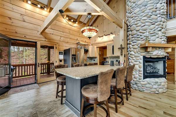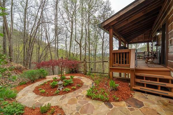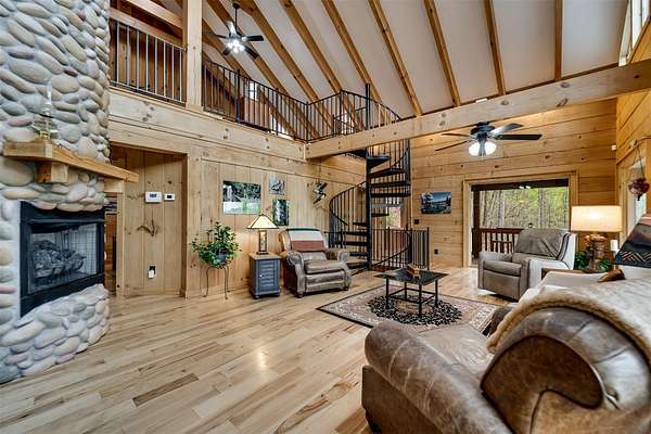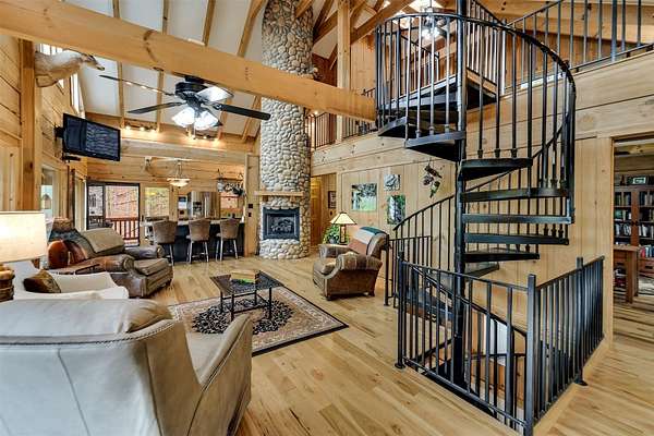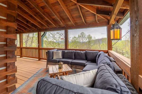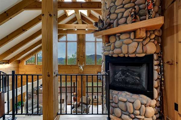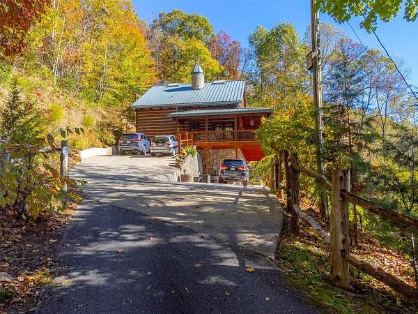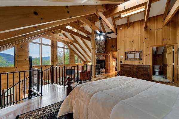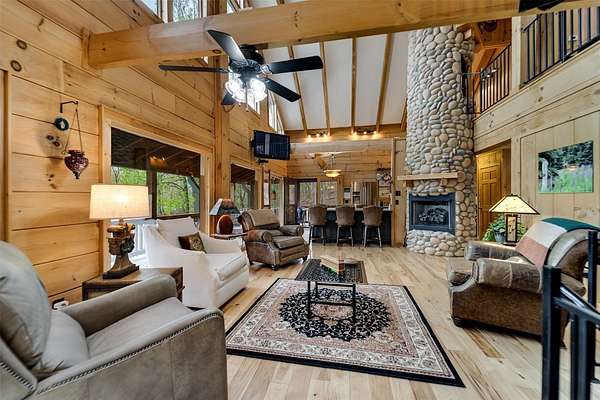 Escape to your mountain dreams in this stunning log home nestled on 2.45 acres of serene landscape. Offering breathtaking views, this meticulously maintained property presents an opportunity for both relaxation and adventure. As you step inside, you're greeted by the warmth of beautiful wood walls, vaulted & beamed ceilings & a fabulous wall of windows that flood the home w/natural light. The cozy kitchen is updated w/leathered granite, attractive custom cabinetry & a convenient laundry room, plus large pantry closet. The main floor boasts 2 BRs, full bath and a striking 2-story stone, gas log fireplace providing warmth & ambiance for the main & upper levels. The loft area primary suite features the 2nd fireplace, private bath, walk-in closet w/attic storage access & a fabulous view! Venture downstairs to discover a versatile lower level offering endless possibilities w/large family room, 2 bonus rooms, large full bath & plenty of mountain sunshine. Outdoors you'll love the huge covered deck & lower terrace, lovely landscaping & rock work, plus a walking path to a small creek on the 2nd lot. Private & peaceful, paved drive & easy access to all the area has to offer. Welcome home!